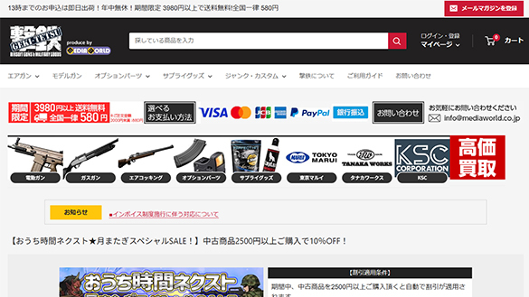 エアガン・モデルガン、そしてミリタリーグッズの専門通販サイトです。圧倒的な品揃えと「掘り出し物」が見つかる楽しさ。初心者向けの定番モデルから、ベテランも唸るレアな中古品まで、揃える店舗を目指しています